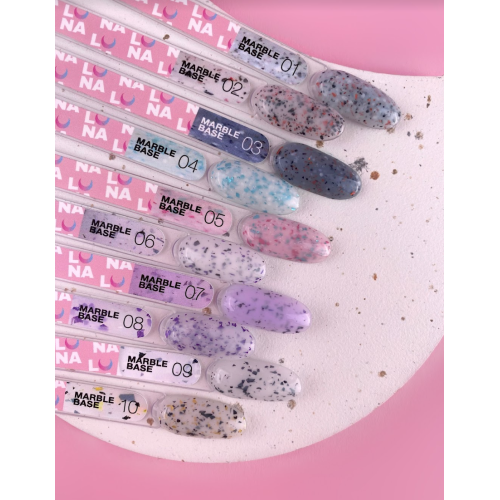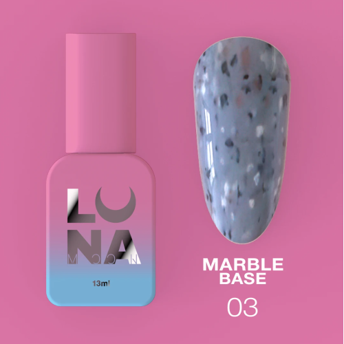 Marble Base №3 — це камуфлююча база в сірому (бетонному) кольорі з різнокольоровою поталлю, що повністю замінить Вам гель-лак. Вона містить у собі частинки різної форми, які додають глибини та більш цікавого ефекту. База гарно виглядає у глянцевому варіанті, а ще цікавіше у матовому.