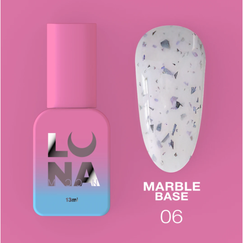 Marble Base №6 — це камуфлююча база, що повністю замінить Вам гель-лак. Вона містить у собі частинки різної форми, які додають глибини та більш цікавого ефекту. База гарно виглядає у глянцевому варіанті, а ще цікавіше у матовому.
