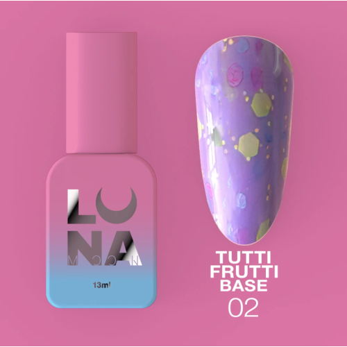 TUTTI FRUTTI BASE 02 — це камуфлююча база у фіолетовому кольорі з різними кольоровими вкрапленнями, що повністю замінити Вам гель-лак.