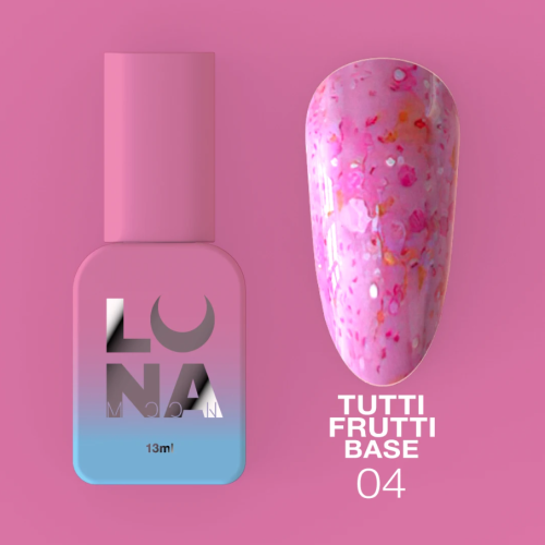 TUTTI FRUTTI BASE 04 — це камуфлююча база в розовому кольорі з різними кольоровими вкрапленнями, що повністю замінити Вам гель-лак.