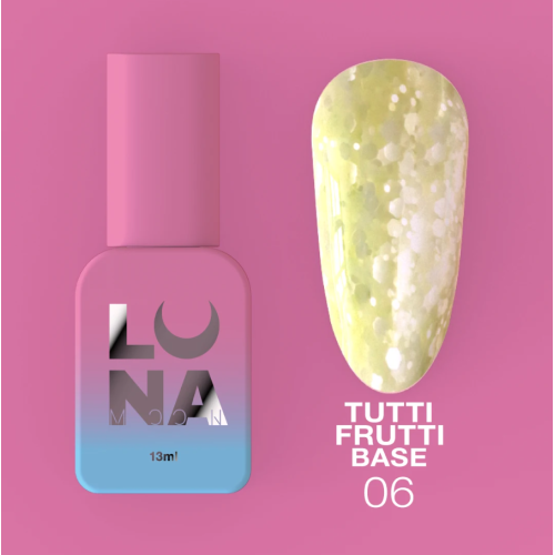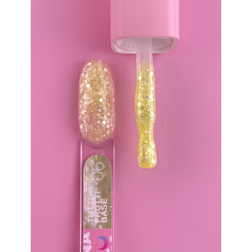 TUTTI FRUTTI BASE 06 — це камуфлююча база в жовтому кольорі з різними кольоровими вкрапленнями, що повністю замінити Вам гель-лак.