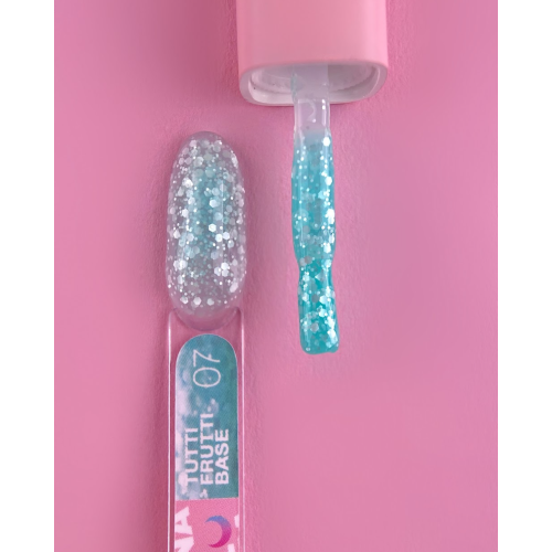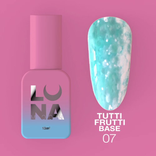 TUTTI FRUTTI BASE 07 — це камуфлююча база в бірюзовому кольорі з різними кольоровими вкрапленнями, що повністю замінить Вам гель-лак.