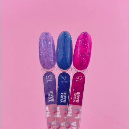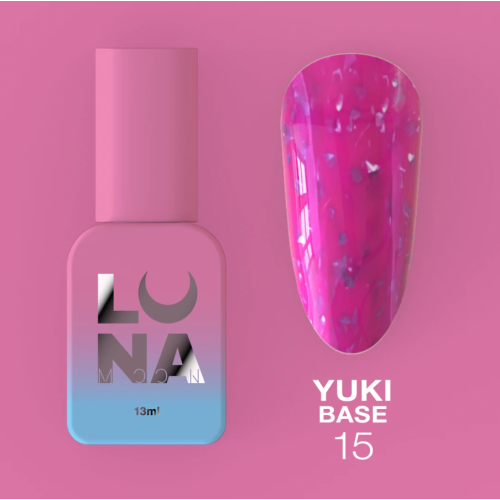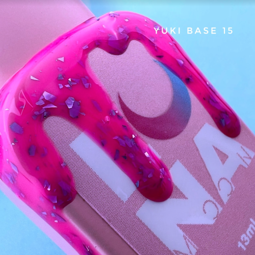 Yuki Base №15 — це камуфлююча база яскравого малинового кольору з ніжно-фіолетовою поталлю, що повністю замінить Вам гель-лак. Вона гарно виглядає у глянцевому варіанті, а ще цікавіше у матовому.