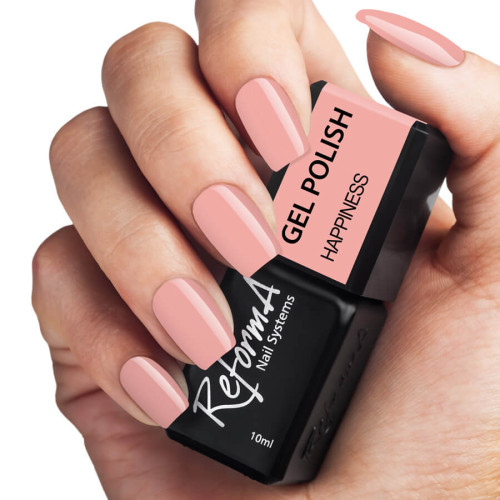 Гель-лак ReformA Happiness, 10 мл ReformA Cosmetics - це виробник професійної косметики для салонного використання. Гель-лаки ReformA мають великий асортимент кольорів та відтінків. Склади засобів мають досить густу, але не розтікається консистенцією. Завдяки унікальній інноваційній формулі засіб легко і просто наноситься на нігтьову пластину і утворює гладке покриття без різних нерівностей і грудок. Багато професіоналів відзначають, що лаки мають досить зручний пензлик: широкий, але набирає оптимальну кількість лаку для одного нігтя. При дотриманні технології та правил нанесення стійкість становить до 3-5 тижнів без тріщин та потемнінь.
