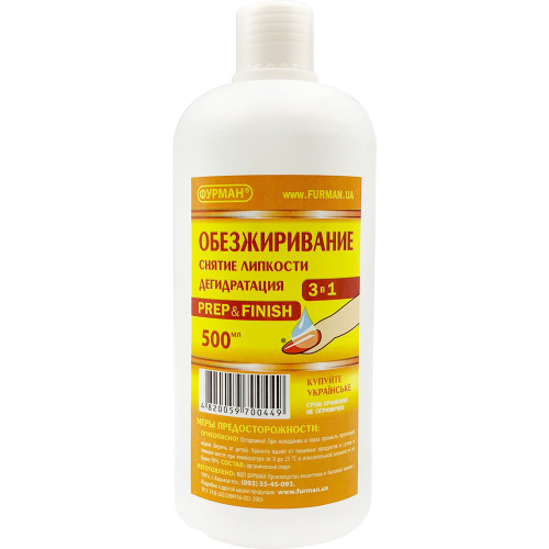 Засіб для знежирення та зняття липкості (prep &ish; finish ) Знежирювач призначений для підготовки нігтьової пластини до нанесення декоративного лаку. Він усуває забруднення, зайву вологу і жир, тим самим сприяє кращому зчепленню матеріалу з натуральним нігтем.